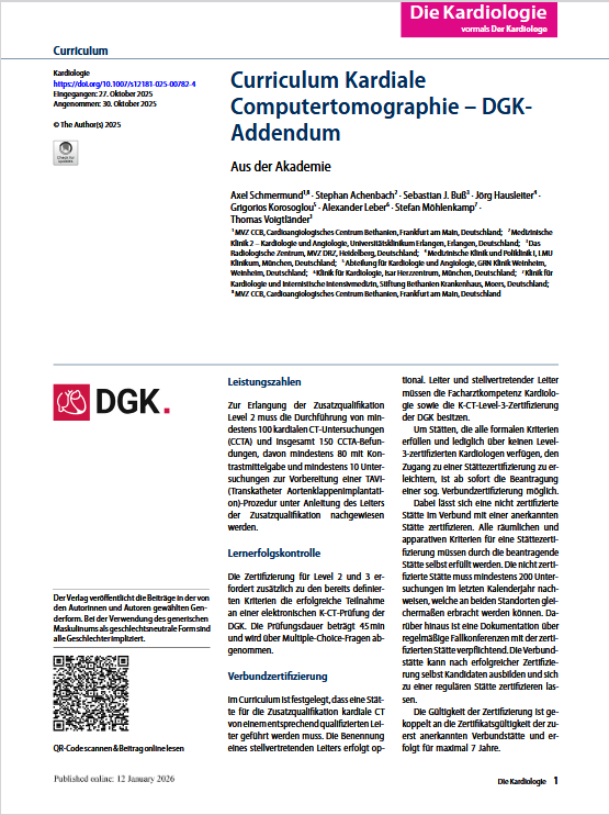 Das vorliegende Curriculum beschreibt einen strukturierten Ausbildungsprozess, mit dem Kardiologen* die Zusatzqualifikation Kardiale Computertomographie erlangen können. Die Ausbildung wird von der Fachgesellschaft definiert und nach einheitlichen Qualitätskriterien zertifiziert. Drei Ausbildungsstufen gehen mit einer zunehmend höheren Qualifikation einher, beginnend in Stufe 1 vor allem mit der Indikationsstellung zur kardialen CT, ihrer diagnostischen Wertigkeit sowie dem Vergleich mit alternativen diagnostischen Verfahren. Die 2. Stufe fügt spezielle Kompetenzen in der kardialen CT hinzu, die eine selbstständige Durchführung der Untersuchung ermöglichen. Die 3. Stufe befähigt den Kardiologen, eigenständig und unter Beachtung der Strahlenschutzvorschriften ein kardiales CT zu betreiben und die Ausbildung zur Zusatzqualifikation kardiale CT zu leiten. Neben der individuellen Weiterbildung werden auch der Zertifizierungsprozess von Ausbildungszentren beschrieben und die Prüfung der Ausbildungskandidaten. Dabei wird das kardiologische Weiterbildungscurriculum der deutschen Fachgesellschaft ebenso berücksichtigt wie die nationalen und europäischen Konsensus Empfehlungen zur kardiovaskulären Bildgebung.